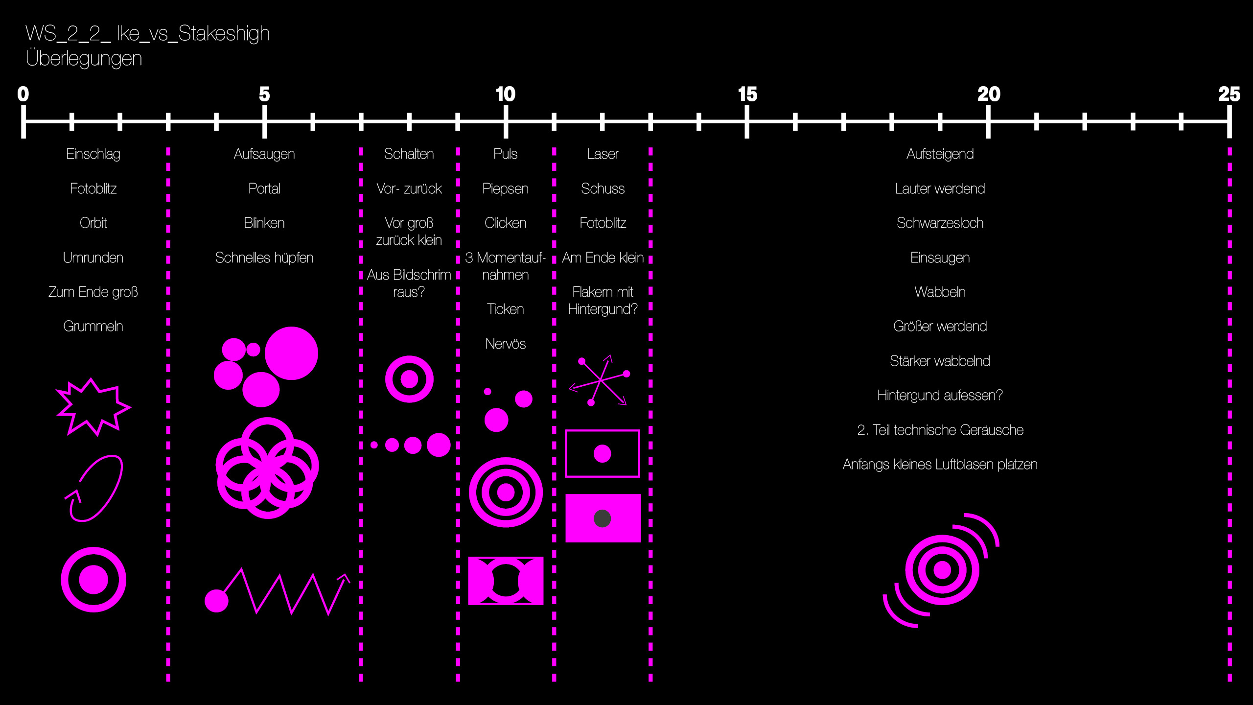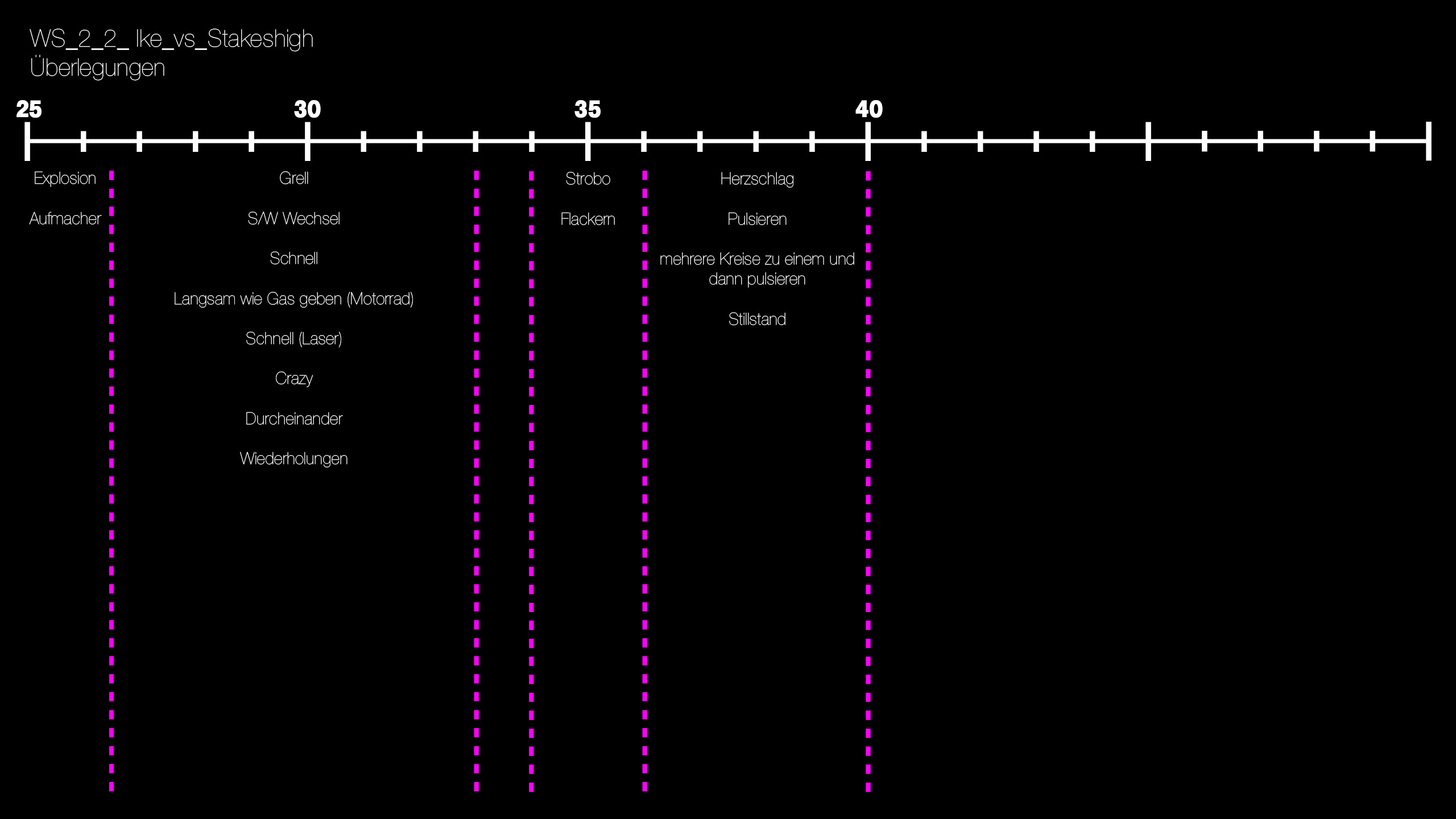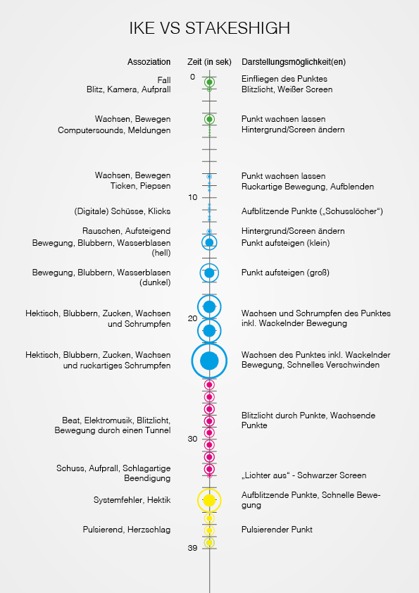 In diesem Workshop musste ebenfalls ausschließlich mit einem Punkt sowie einer reinen schwarz-weiß Szene gearbeitet werden. Aufgabe war es die Audiovorlage „Ike_vs_Stakeshigh“ von Michael Fakesch zu interpretieren und mit Bewegung zu visualisieren.