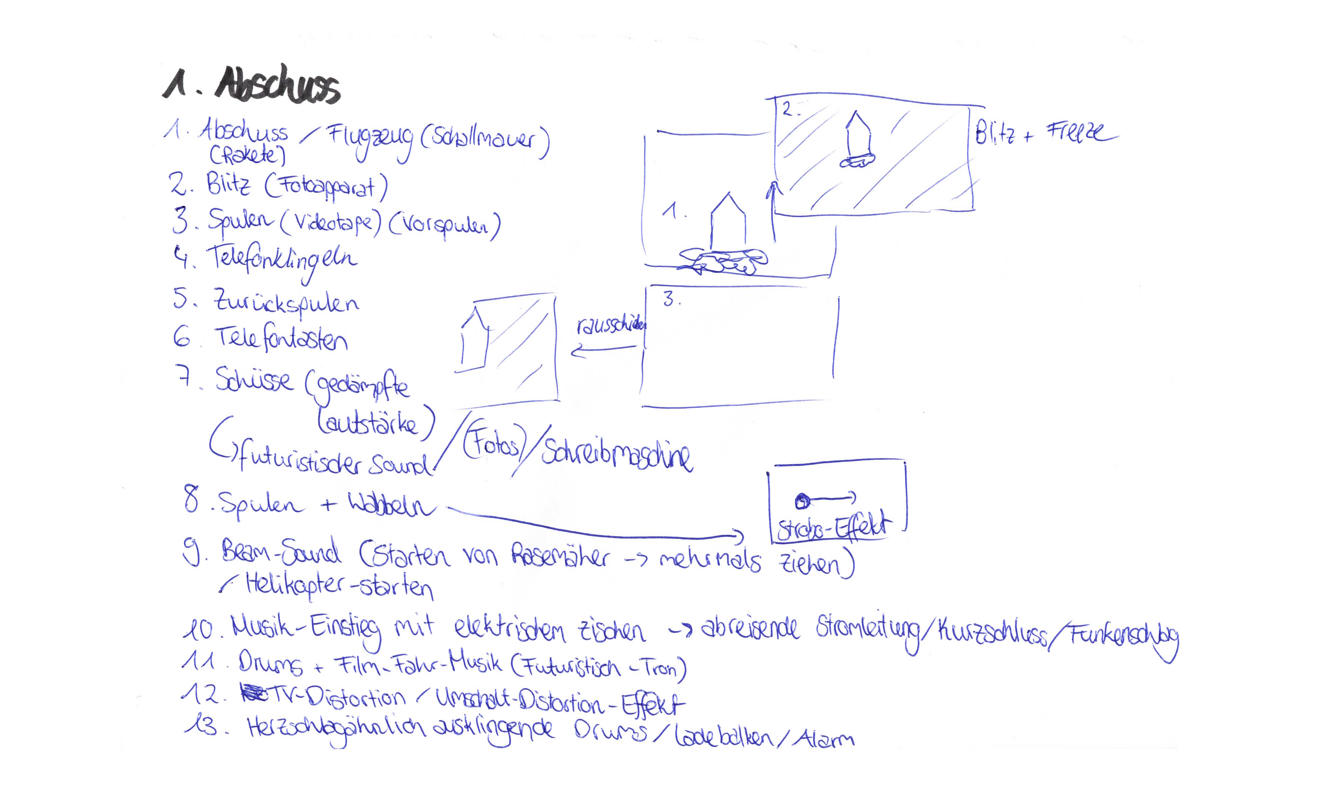 In dieser Aufgabe sollten wir Musik visualiseren. Zu Beginn habe ich alles notiert was mir zu den Geräuschen eingefallen ist. Dabei habe ich auch gemerkt, dass es sich anbietet die Tonspur in unterschiedliche Sequenzen beziehungsweise Sounds zu untergliedern.
